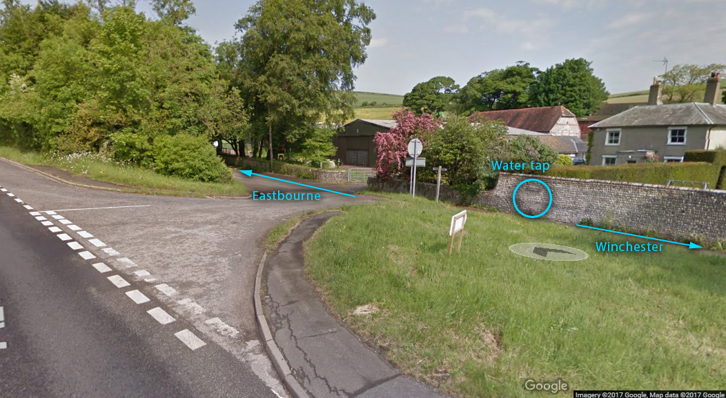 Housedean farm. Tap is attached to the wall alongside the A27 before the slip road.