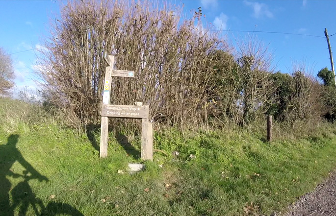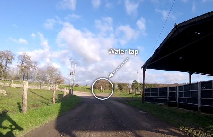 Heading from Winchester through the farm, you will find the tap against the hedge just on the right hand bend after passing through the barns.